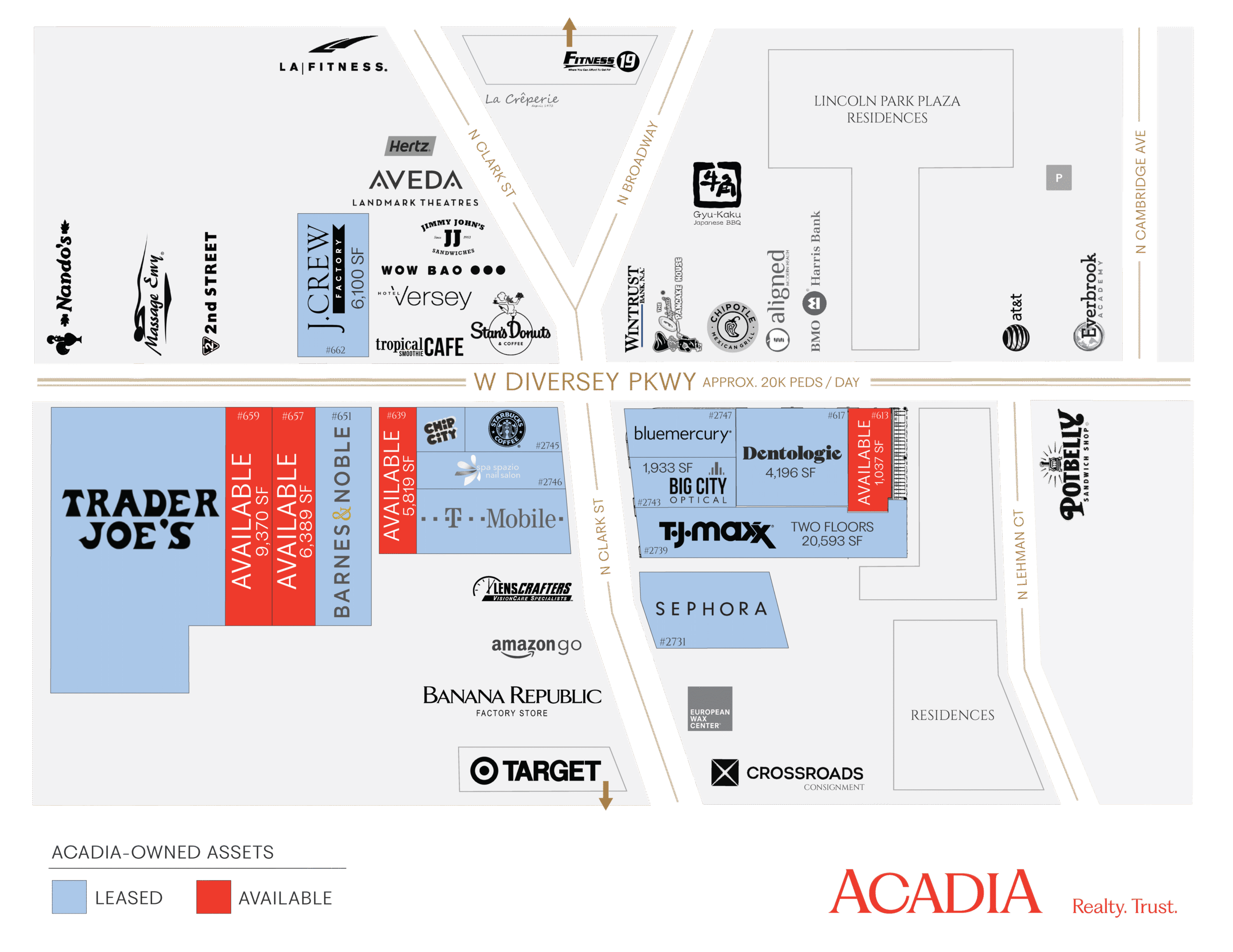 The intersection of Clark and Diversey is a dynamic retail corridor in the heart of Lincoln Park, an affluent neighborhood just north of downtown Chicago. Our portfolio of buildings includes Barnes and Noble, Blue Mercury, J Crew, Trader Joe’s, and Starbucks. The intersection benefits from its location four blocks from the Diversey CTA Brown Line station and one mile from the center of DePaul University’s main campus.