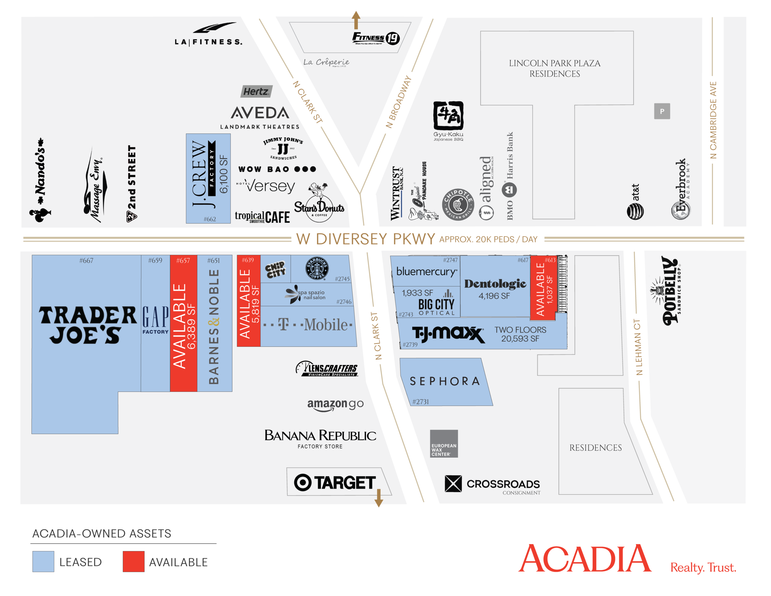 The intersection of Clark and Diversey is a dynamic retail corridor in the heart of Lincoln Park, an affluent neighborhood just north of downtown Chicago. Our portfolio of buildings includes Barnes and Noble, Blue Mercury, J Crew, Trader Joe’s, GAP Factory and Starbucks. The intersection benefits from its location four blocks from the Diversey CTA Brown Line station and one mile from the center of DePaul University’s main campus.
