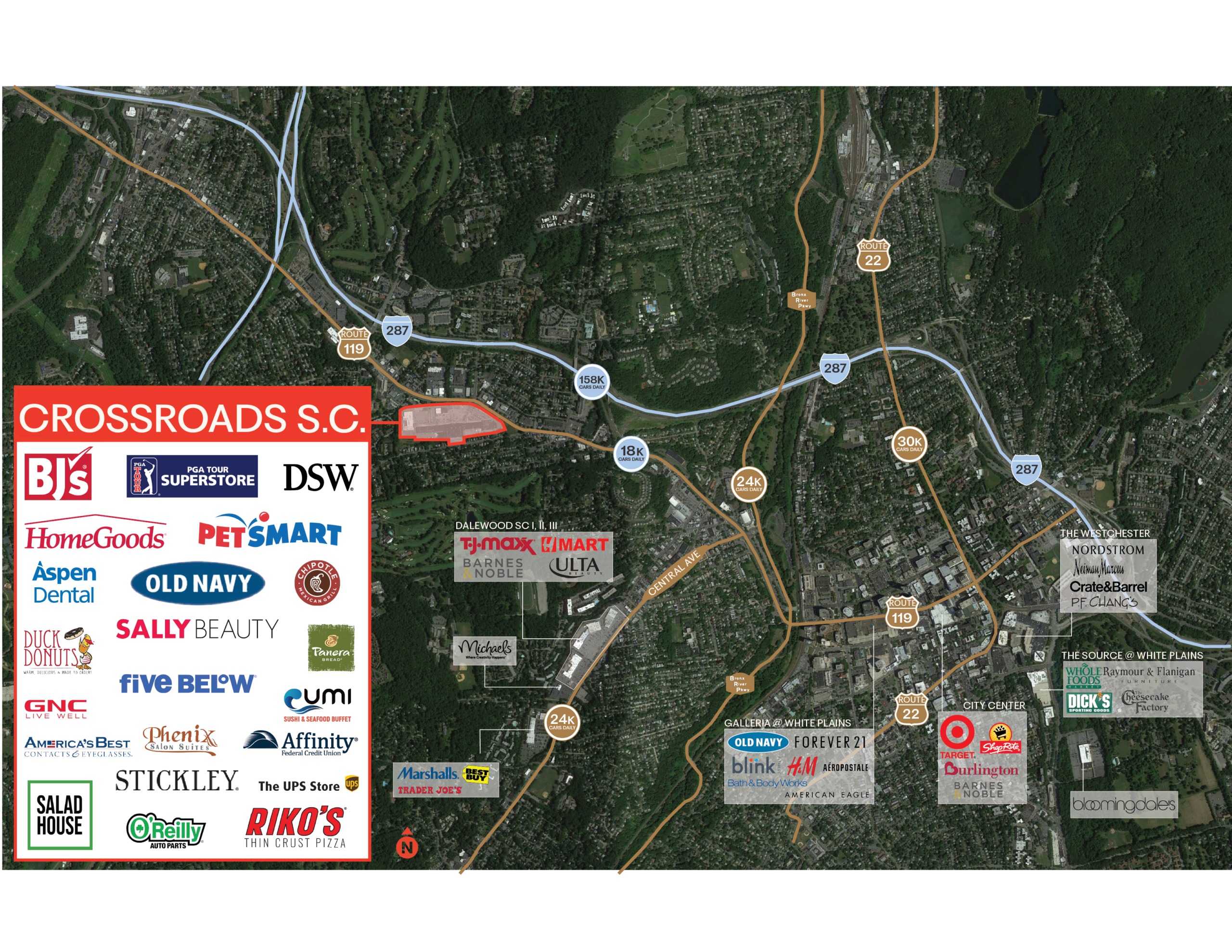 The Crossroads Shopping Center is located just west of downtown White Plains on Route 119 (Tarrytown-White Plains Road), one of the primary retail destinations in Westchester County. Accessible from both 1-287 and the Central Avenue retail corridor, Crossroads includes the brand new BJ’s Wholesale Club, O’Reilly Auto Parts and Stickley Furniture as well as PGA Tour Superstore, HomeGoods, PetSmart, Five Below and DSW amongst its tenants.