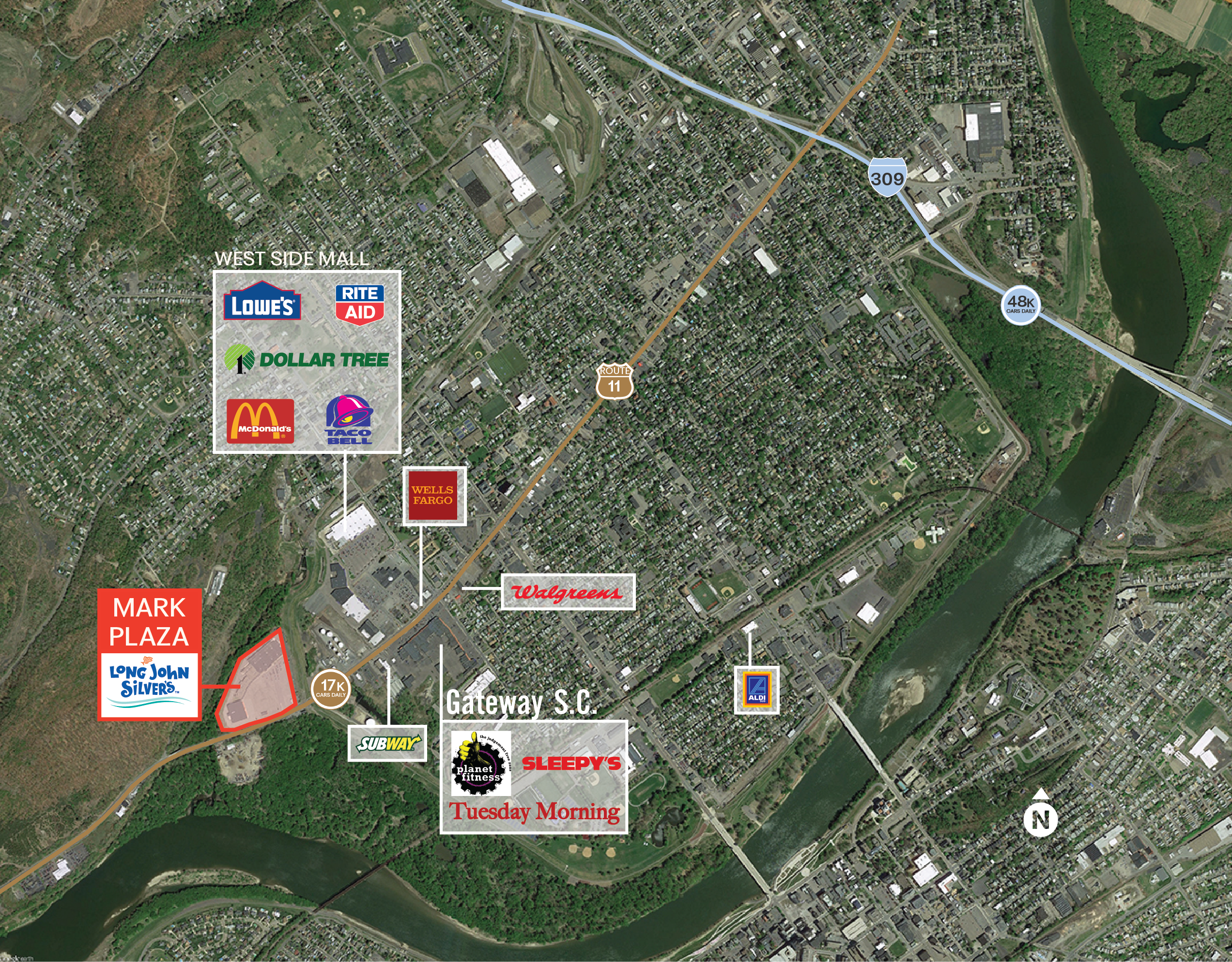 Mark Plaza is located on the west side of the heavily trafficked Route 11, a major north-south thoroughfare in Edwardsville, Pennsylvania. Positioned in the main retail hub west of the city of Wilkes-Barre, Mark Plaza serves a densely populated trade area that includes the residential neighborhoods and business communities of Edwardsville, Larksville, Kingston, Forty Fort Boroughs, Luzerne and Wilkes-Barre.