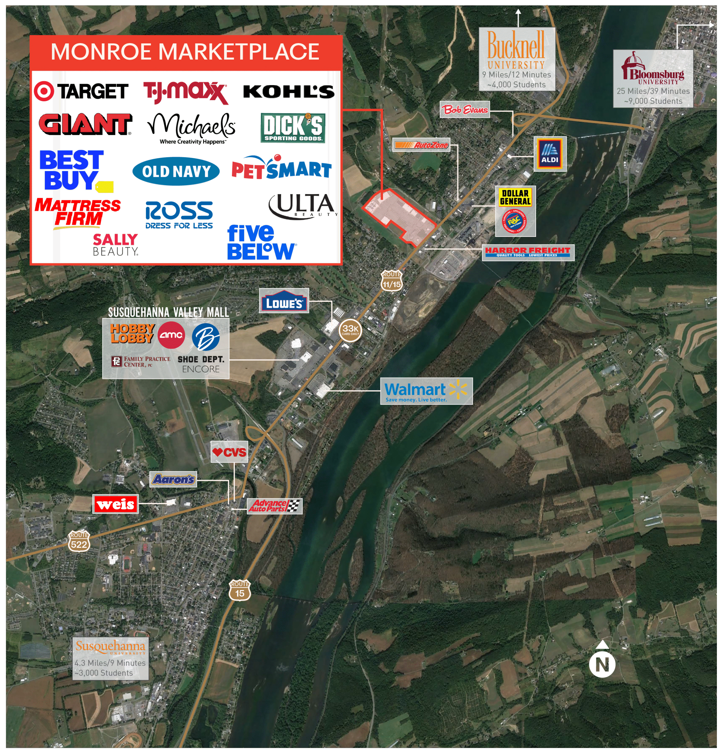 Monroe Marketplace is prominently located on Route 11/15, one of the most highly trafficked intersections within the market, with a traffic count exceeding 30,000 VPD. The property is the center for ~135,000 people in the surrounding trade area as well as 3 universities with approximately 16,000 students. Monroe Marketplace is shadow anchored by Target, anchored by Giant & Kohl’s and has a lineup of prominent junior anchors including: TJ Maxx, Dick’s Sporting Goods, Ross Dress For Less, Five Below, Best Buy and Old Navy.
