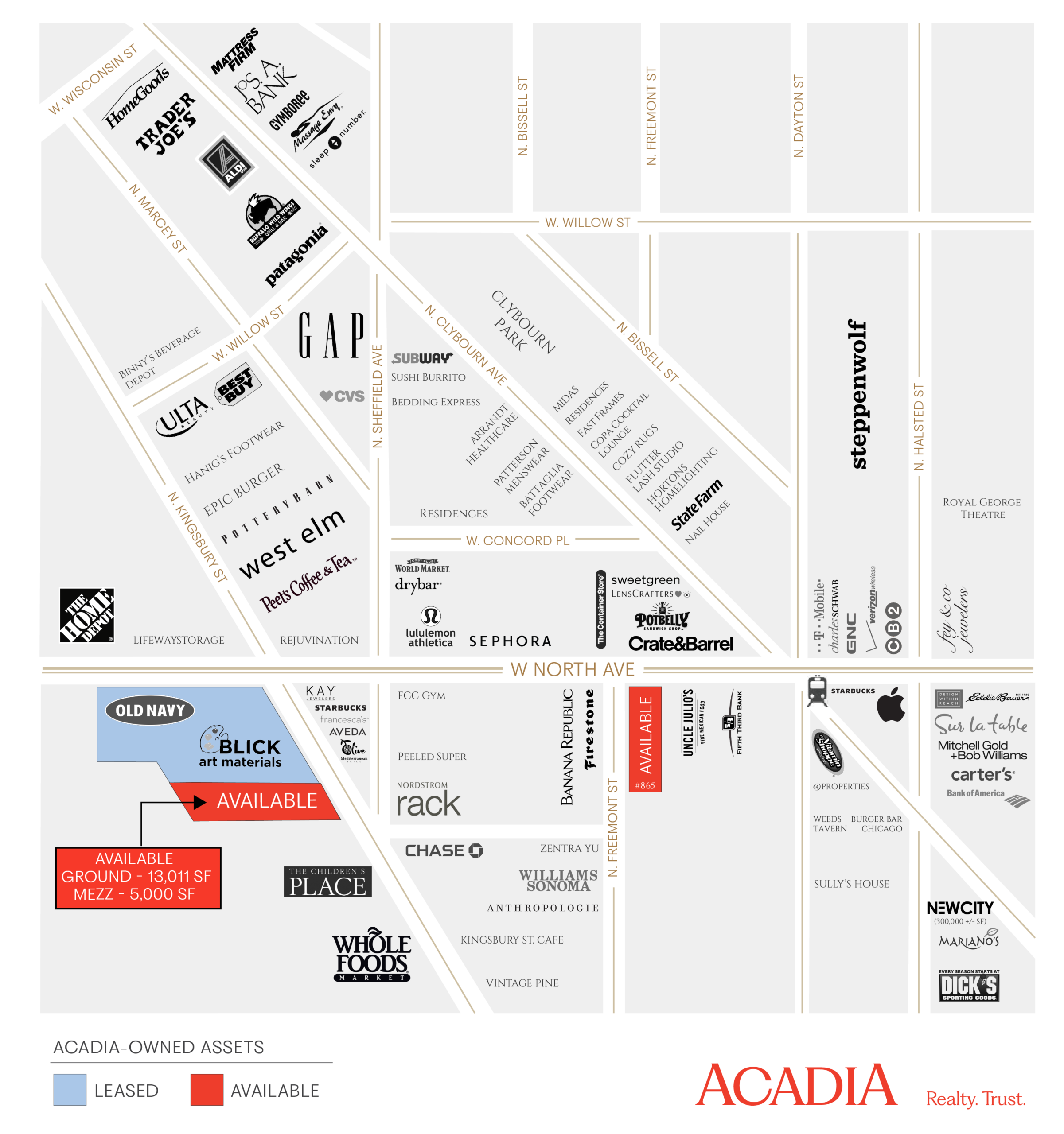 North And Kingsbury Center is located in the heart of Lincoln Park’s premier retail corridor, concentrated along North Avenue. The North Avenue corridor features a critical mass of national retailers including Whole Foods, Pottery Barn, Apple, Nordstrom Rack, DSW, Williams-Sonoma, Anthropolgie, Athleta, J. Crew, REI, Crate & Barrel, The Container Store, Best Buy, World Market, and many others. North & Kingsbury Center is a 41,700 square foot shopping center that is ideally positioned at one of the best intersections in Lincoln Park, directly adjacent to the flagship Whole Foods. The corridor serves as the primary retail destination for many of Chicago’s most affluent neighborhoods, including Lincoln Park, the Gold Coast, Bucktown/Wicker Park, Lakeview, and Roscoe Village.
