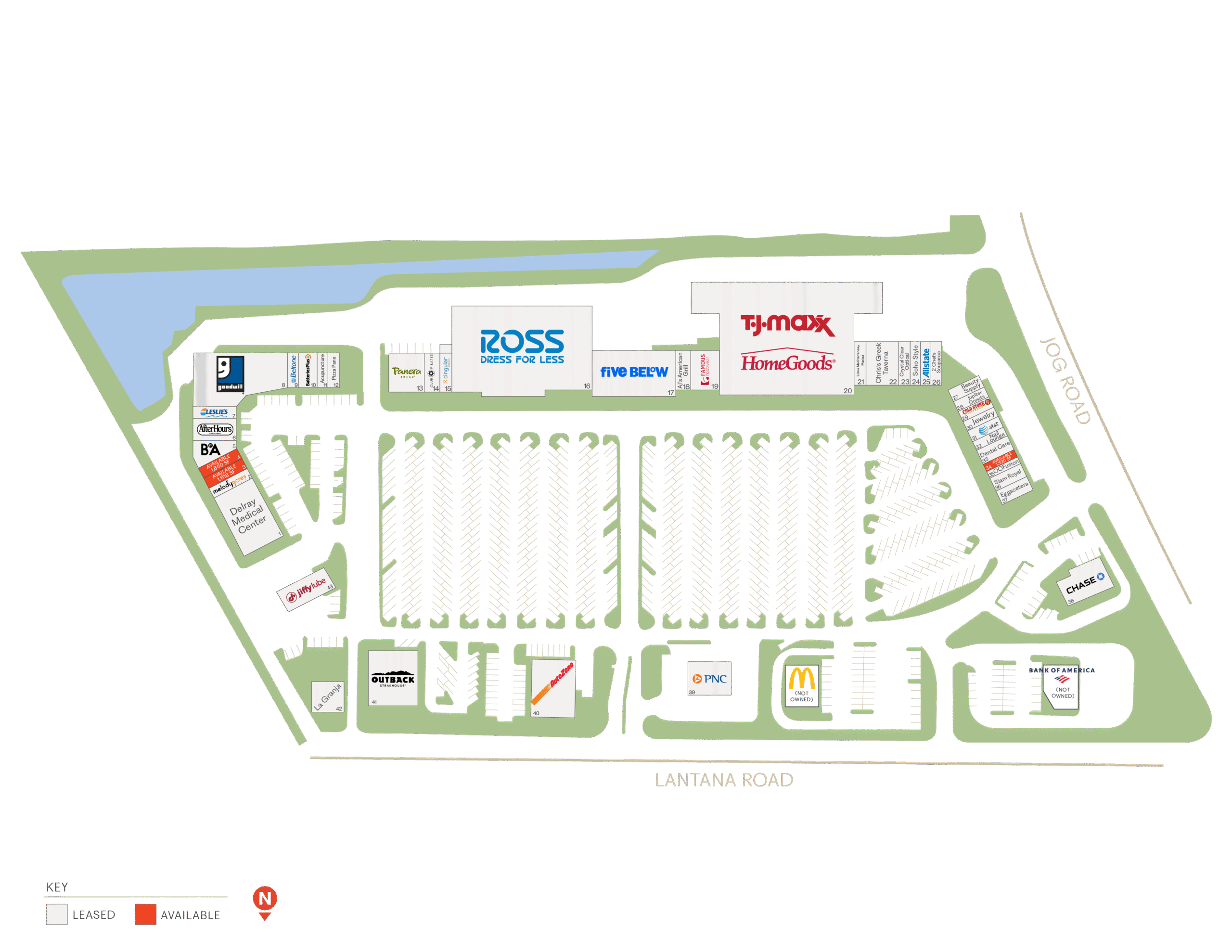 Pinewood Square is a high-performing retail center located at the dominant intersection of Lantana Road and Jog Road in the heart of Palm Beach County, drawing from a dense, affluent trade area with 125,000 residents and an average household income of $121K within a 3-mile radius. Anchored by best-in-class retailers including TJ Maxx, HomeGoods, and Ross, and supported by strong junior anchors such as Goodwill, Five Below, and Delray Medical, the center benefits from a seasoned tenant mix. High visibility and traffic, with 84,500 VPD, and a robust co-tenancy at the intersection that includes Publix, Home Depot, and Walmart Neighborhood Market, make Pinewood Square a key retail destination in the region.