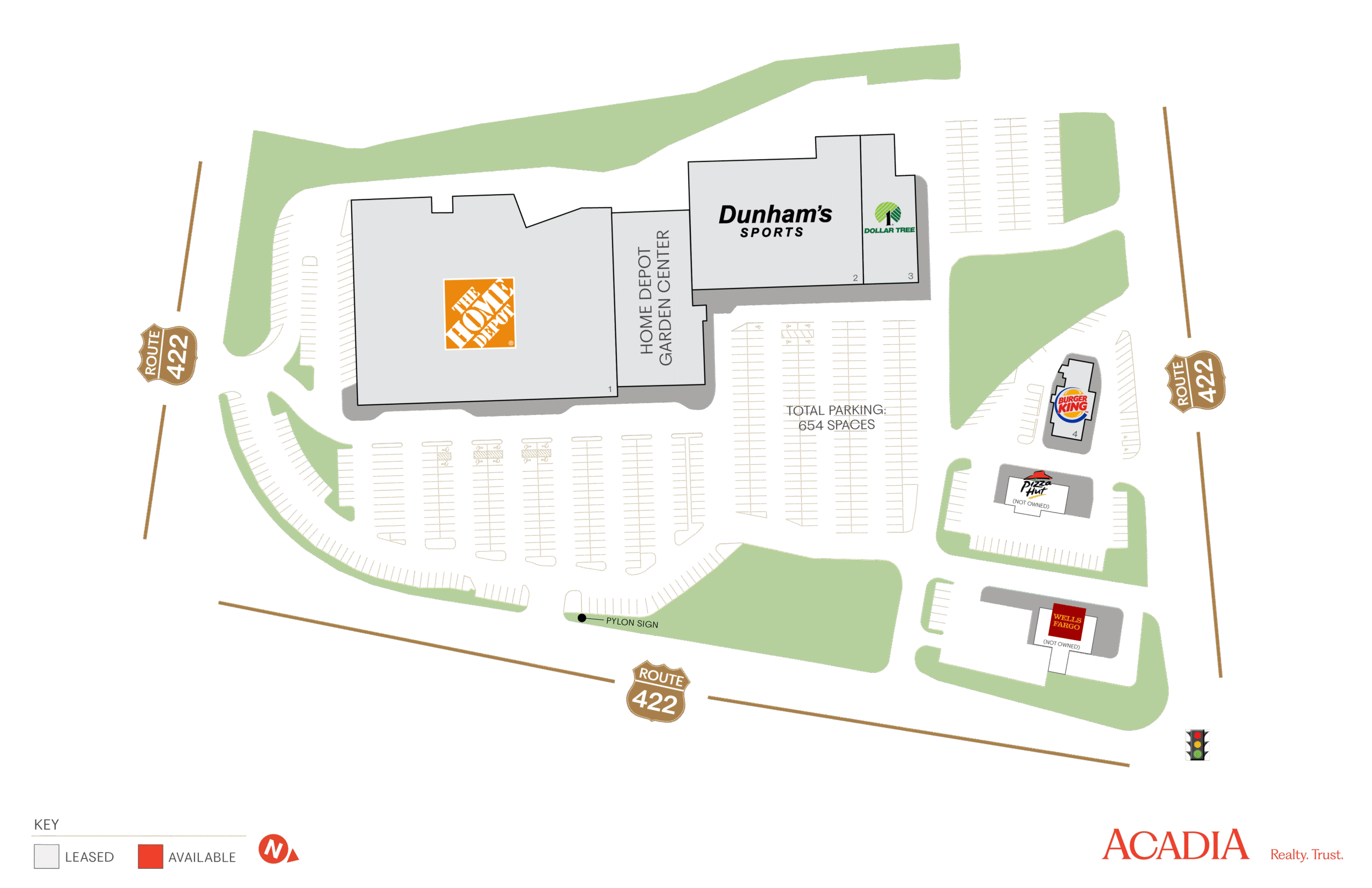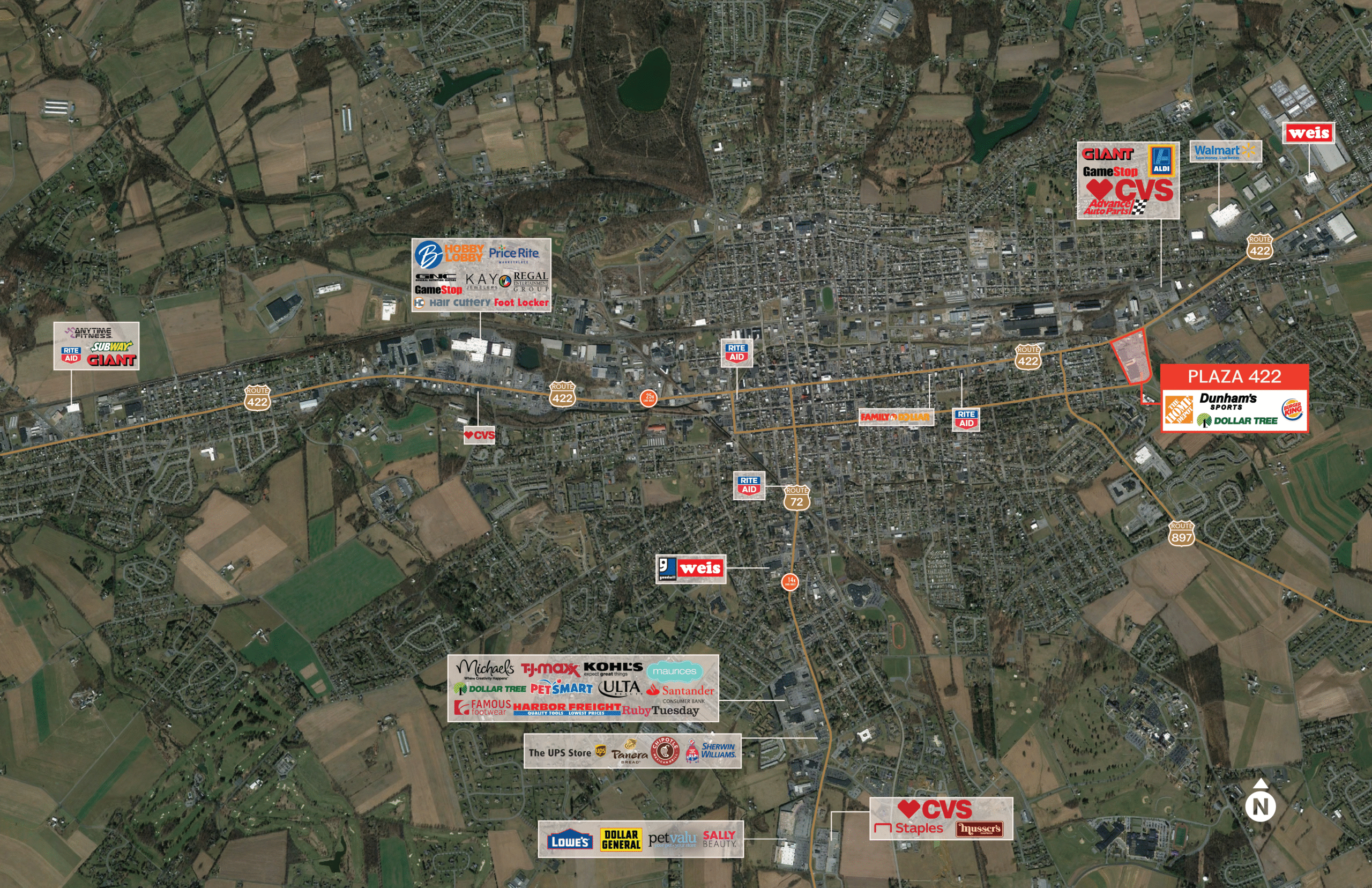 Plaza 422 is located one mile east of the central business district of Lebanon, Pennsylvania, at the southwest corner of East Cumberland Street and East Walnut Street. Plaza 422 has excellent visibility from and access via four entrances to Route 422, a major east-west thoroughfare. The surrounding neighborhoods provide a mixture of commercial, retail, business and educational facilities. Plaza 422’s trade area includes the City of Lebanon, Avon Heights, Sandi Hill, Pleasant Hill and Cornwall.